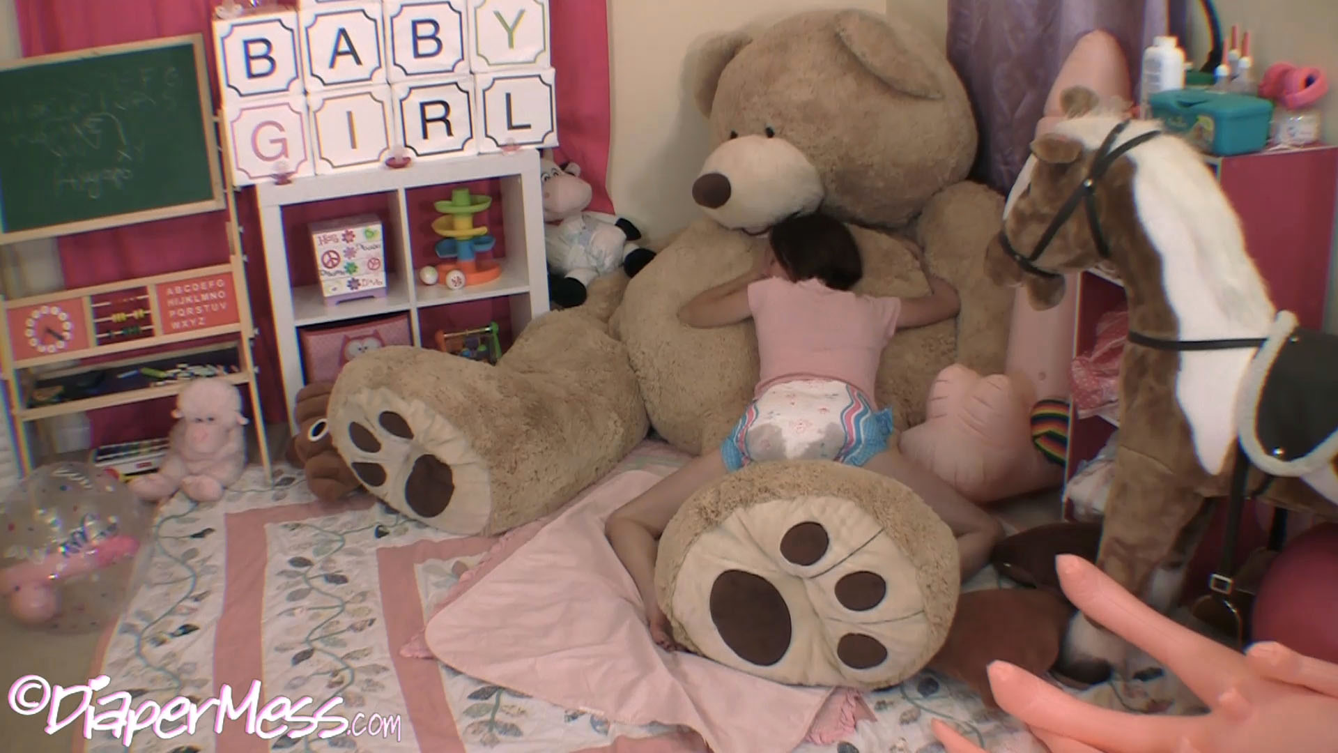 She turns to play with all the giant toys in the nursery and quickly realizes how turned on she is by the warm stickiness inside her diaper. She rubs various toys she finds in the nursery on her messy enema diaper.